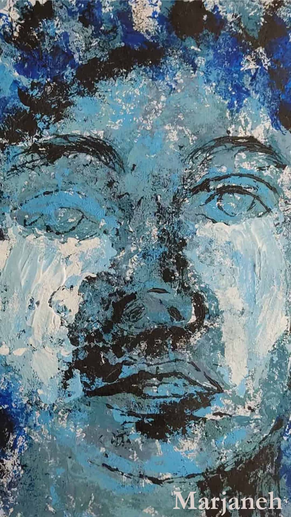 This expressive acrylic artwork captures the sorrowful face of a young man in tones of blue and black. Created without a single brushstroke, the image was formed by pressing strips of paint-laden plastic onto paper and drawing blind lines with a metal tip. A raw and emotional piece, now available as a high-resolution wallpaper for your phone.
